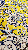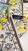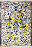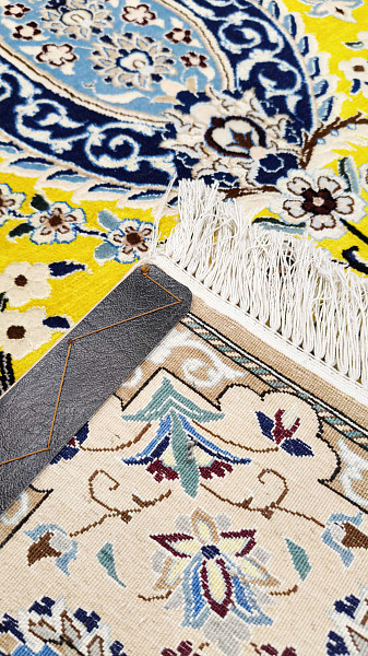 Рисунок состоит из переплетающихся мелких цветочков и веток. Характерное сочетание голубоватых тонов и цвета слоновой кости стало настоящей торговой маркой здешних мастеров. В персидском языке существуют специальные технические наименования -кхахарла, шешла и нохья, -которые обозначают кол-во нитей в пряди (соответственно 4,6 и 9). Между тем Наин, хотя и расположен неподалеку от издавна славившегося своими коврами Исфахана, сам не является древним центром ковроткачества. Многочисленные мануфактуры по производству ковров ручной работы появились здесь лишь в первой половине 20 века. Однако за короткий, по меркам истории ковра, срок город стал одним из самых знаменитых центров коврового производства.