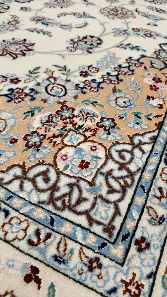 Рисунок состоит из переплетающихся мелких цветочков и веток. Характерное сочетание голубоватых тонов и цвета слоновой кости стало настоящей торговой маркой здешних мастеров. В персидском языке существуют специальные технические наименования -кхахарла, шешла и нохья, -которые обозначают кол-во нитей в пряди (соответственно 4,6 и 9). Между тем Наин, хотя и расположен неподалеку от издавна славившегося своими коврами Исфахана, сам не является древним центром ковроткачества. Многочисленные мануфактуры по производству ковров ручной работы появились здесь лишь в первой половине 20 века. Однако за короткий, по меркам истории ковра, срок город стал одним из самых знаменитых центров коврового производства.