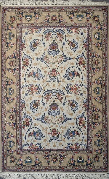 Рисунок состоит из переплетающихся мелких цветочков и веток. Характерное сочетание голубоватых тонов и цвета слоновой кости стало настоящей торговой маркой здешних мастеров. В персидском языке существуют специальные технические наименования -кхахарла, шешла и нохья, -которые обозначают кол-во нитей в пряди (соответственно 4,6 и 9). Между тем Наин, хотя и расположен неподалеку от издавна славившегося своими коврами Исфахана, сам не является древним центром ковроткачества. Многочисленные мануфактуры по производству ковров ручной работы появились здесь лишь в первой половине 20 века. Однако за короткий, по меркам истории ковра, срок город стал одним из самых знаменитых центров коврового производства.
