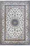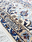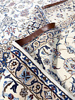 Рисунок состоит из переплетающихся мелких цветочков и веток. Характерное сочетание голубоватых тонов и цвета слоновой кости стало настоящей торговой маркой здешних мастеров. В персидском языке существуют специальные технические наименования -кхахарла, шешла и нохья, -которые обозначают кол-во нитей в пряди (соответственно 4,6 и 9). Между тем Наин, хотя и расположен неподалеку от издавна славившегося своими коврами Исфахана, сам не является древним центром ковроткачества. Многочисленные мануфактуры по производству ковров ручной работы появились здесь лишь в первой половине 20 века. Однако за короткий, по меркам истории ковра, срок город стал одним из самых знаменитых центров коврового производства.