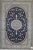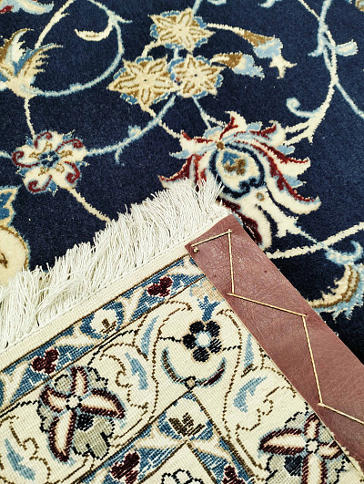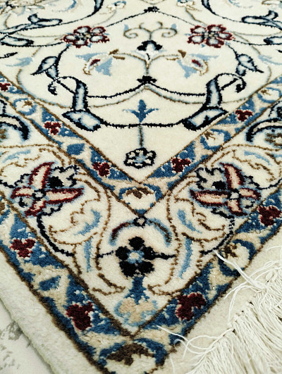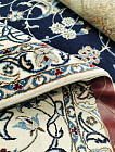 Рисунок состоит из переплетающихся мелких цветочков и веток. Характерное сочетание голубоватых тонов и цвета слоновой кости стало настоящей торговой маркой здешних мастеров. В персидском языке существуют специальные технические наименования -кхахарла, шешла и нохья, -которые обозначают кол-во нитей в пряди (соответственно 4,6 и 9). Между тем Наин, хотя и расположен неподалеку от издавна славившегося своими коврами Исфахана, сам не является древним центром ковроткачества. Многочисленные мануфактуры по производству ковров ручной работы появились здесь лишь в первой половине 20 века. Однако за короткий, по меркам истории ковра, срок город стал одним из самых знаменитых центров коврового производства.