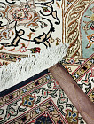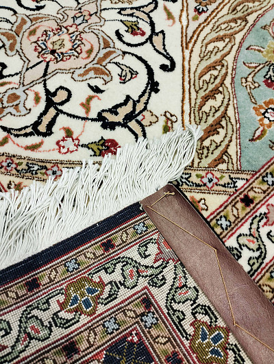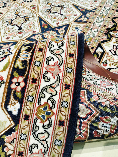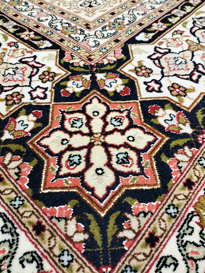 Ковры в сочетании шерсти с шелком из Табриза отличаются аккуратным и кропотливым плетением, вид узла может быть как симметричным, так и асимметричным. Используемые материалы (шерсть, шелк и хлопок) - всегда очень высокого качества. Растительный орнамент, как правило, выполненный на светлой основе, может быть с медальоном в центре или же без него (афшан). Композиции с медальоном, сад, дерево жизни. Кроме того, существует местная композиция, называемая эсуми, предоставляющая собой идущие спирально побеги виноградной лозы, нежные и гибкие, связывающие воедино малые сюжетные мотивы с листьями и цветами.
