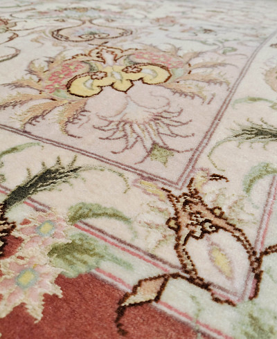 Ковры в сочетании шерсти с шелком из Табриза отличаются аккуратным и кропотливым плетением, вид узла может быть как симметричным, так и асимметричным. Используемые материалы (шерсть, шелк и хлопок) - всегда очень высокого качества. Растительный орнамент, как правило, выполненный на светлой основе, может быть с медальоном в центре или же без него (афшан). Композиции с медальоном, сад, дерево жизни. Кроме того, существует местная композиция, называемая эсуми, предоставляющая собой идущие спирально побеги виноградной лозы, нежные и гибкие, связывающие воедино малые сюжетные мотивы с листьями и цветами.