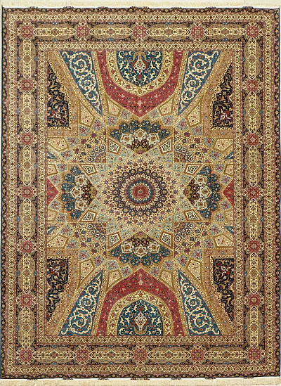 Ковры в сочетании шерсти с шелком из Табриза отличаются аккуратным и кропотливым плетением, вид узла может быть как симметричным, так и асимметричным. Используемые материалы (шерсть, шелк и хлопок) - всегда очень высокого качества. Растительный орнамент, как правило, выполненный на светлой основе, может быть с медальоном в центре или же без него (афшан). Композиции с медальоном, сад, дерево жизни. Кроме того, существует местная композиция, называемая эсуми, предоставляющая собой идущие спирально побеги виноградной лозы, нежные и гибкие, связывающие воедино малые сюжетные мотивы с листьями и цветами.