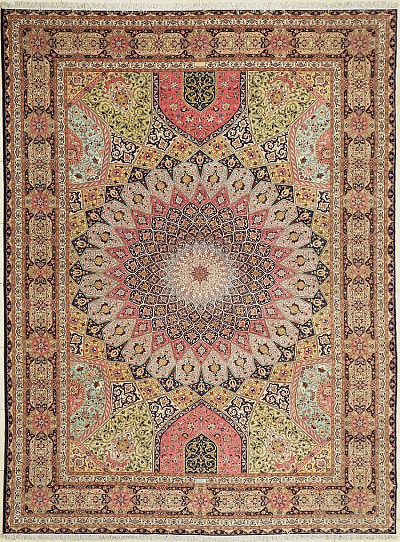 Ковры в сочетании шерсти с шелком из Табриза отличаются аккуратным и кропотливым плетением, вид узла может быть как симметричным, так и асимметричным. Используемые материалы (шерсть, шелк и хлопок) - всегда очень высокого качества. Растительный орнамент, как правило, выполненный на светлой основе, может быть с медальоном в центре или же без него (афшан). Композиции с медальоном, сад, дерево жизни. Кроме того, существует местная композиция, называемая эсуми, предоставляющая собой идущие спирально побеги виноградной лозы, нежные и гибкие, связывающие воедино малые сюжетные мотивы с листьями и цветами.