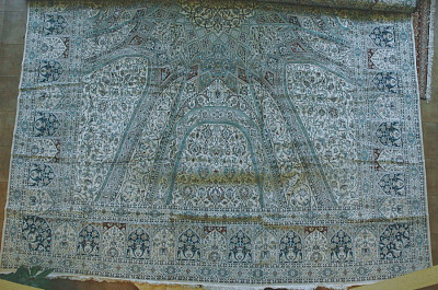 Рисунок состоит из переплетающихся мелких цветочков и веток. Характерное сочетание голубоватых тонов и цвета слоновой кости стало настоящей торговой маркой здешних мастеров. В персидском языке существуют специальные технические наименования -кхахарла, шешла и нохья, -которые обозначают кол-во нитей в пряди (соответственно 4,6 и 9). Между тем Наин, хотя и расположен неподалеку от издавна славившегося своими коврами Исфахана, сам не является древним центром ковроткачества. Многочисленные мануфактуры по производству ковров ручной работы появились здесь лишь в первой половине 20 века. Однако за короткий, по меркам истории ковра, срок город стал одним из самых знаменитых центров коврового производства.