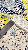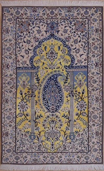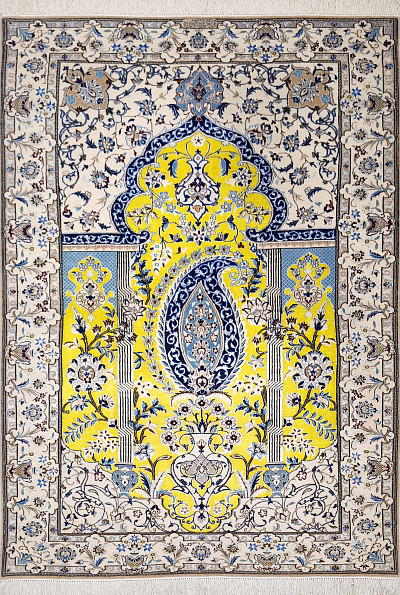 Рисунок состоит из переплетающихся мелких цветочков и веток. Характерное сочетание голубоватых тонов и цвета слоновой кости стало настоящей торговой маркой здешних мастеров. В персидском языке существуют специальные технические наименования -кхахарла, шешла и нохья, -которые обозначают кол-во нитей в пряди (соответственно 4,6 и 9). Между тем Наин, хотя и расположен неподалеку от издавна славившегося своими коврами Исфахана, сам не является древним центром ковроткачества. Многочисленные мануфактуры по производству ковров ручной работы появились здесь лишь в первой половине 20 века. Однако за короткий, по меркам истории ковра, срок город стал одним из самых знаменитых центров коврового производства.