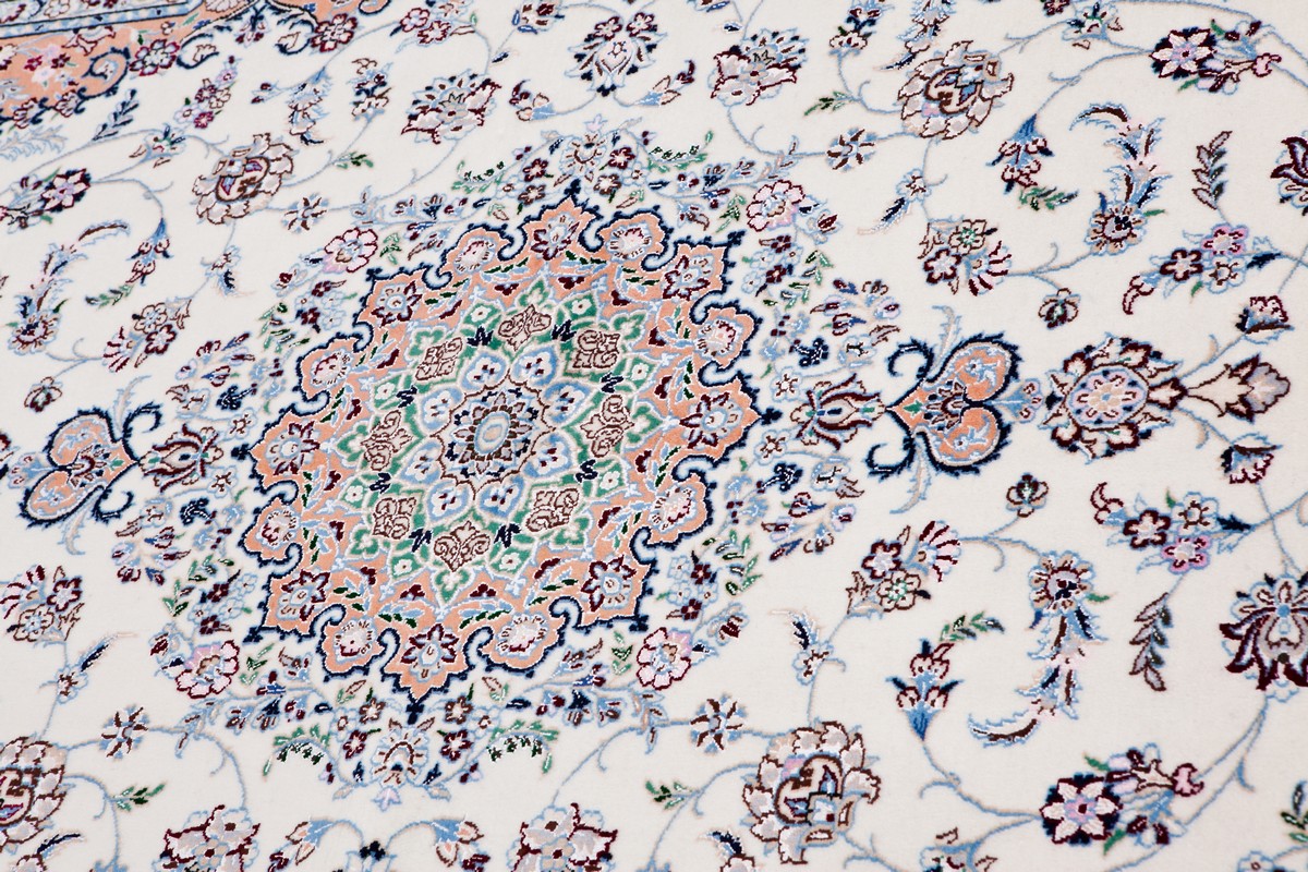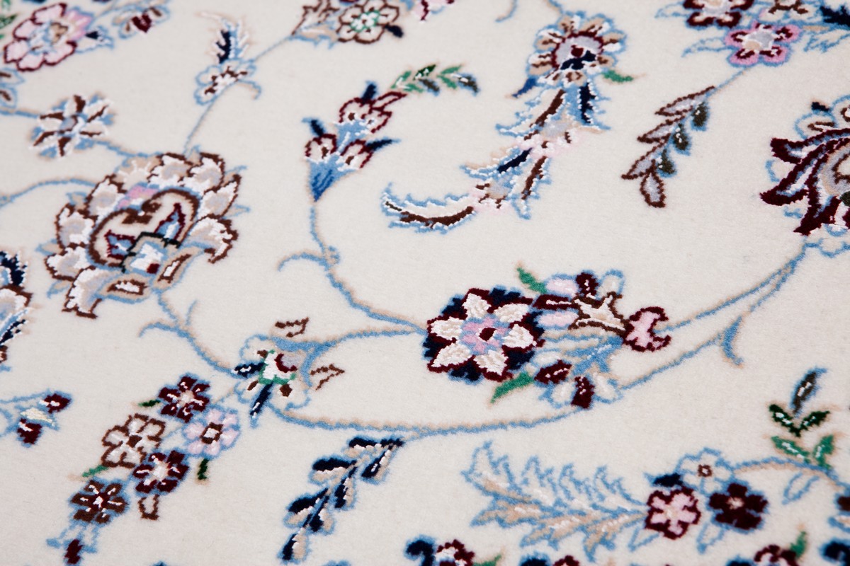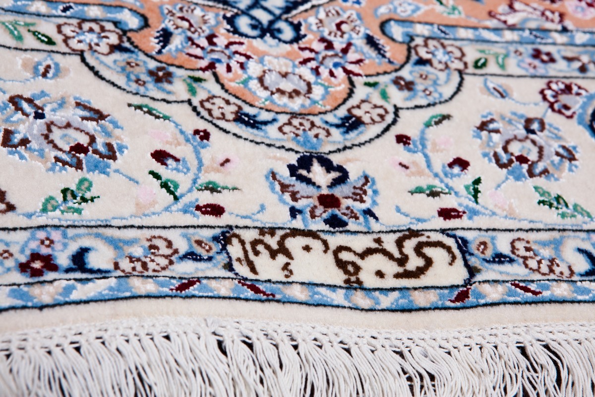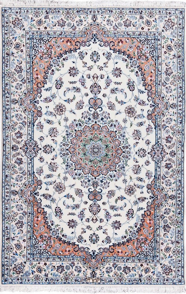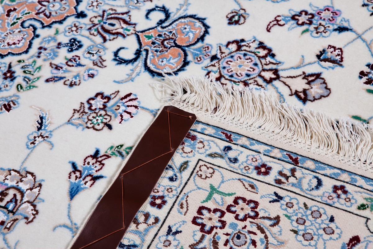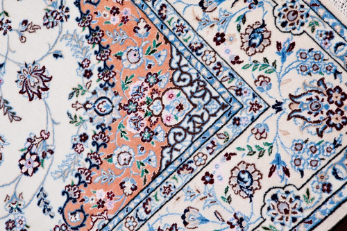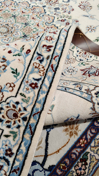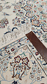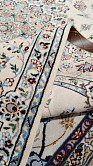 Рисунок состоит из переплетающихся мелких цветочков и веток. Характерное сочетание голубоватых тонов и цвета слоновой кости стало настоящей торговой маркой здешних мастеров. В персидском языке существуют специальные технические наименования -кхахарла, шешла и нохья, -которые обозначают кол-во нитей в пряди (соответственно 4,6 и 9). Между тем Наин, хотя и расположен неподалеку от издавна славившегося своими коврами Исфахана, сам не является древним центром ковроткачества. Многочисленные мануфактуры по производству ковров ручной работы появились здесь лишь в первой половине 20 века. Однако за короткий, по меркам истории ковра, срок город стал одним из самых знаменитых центров коврового производства.
