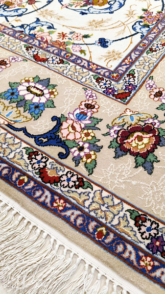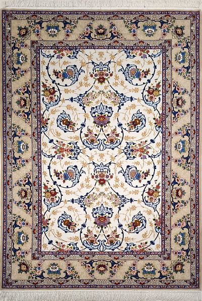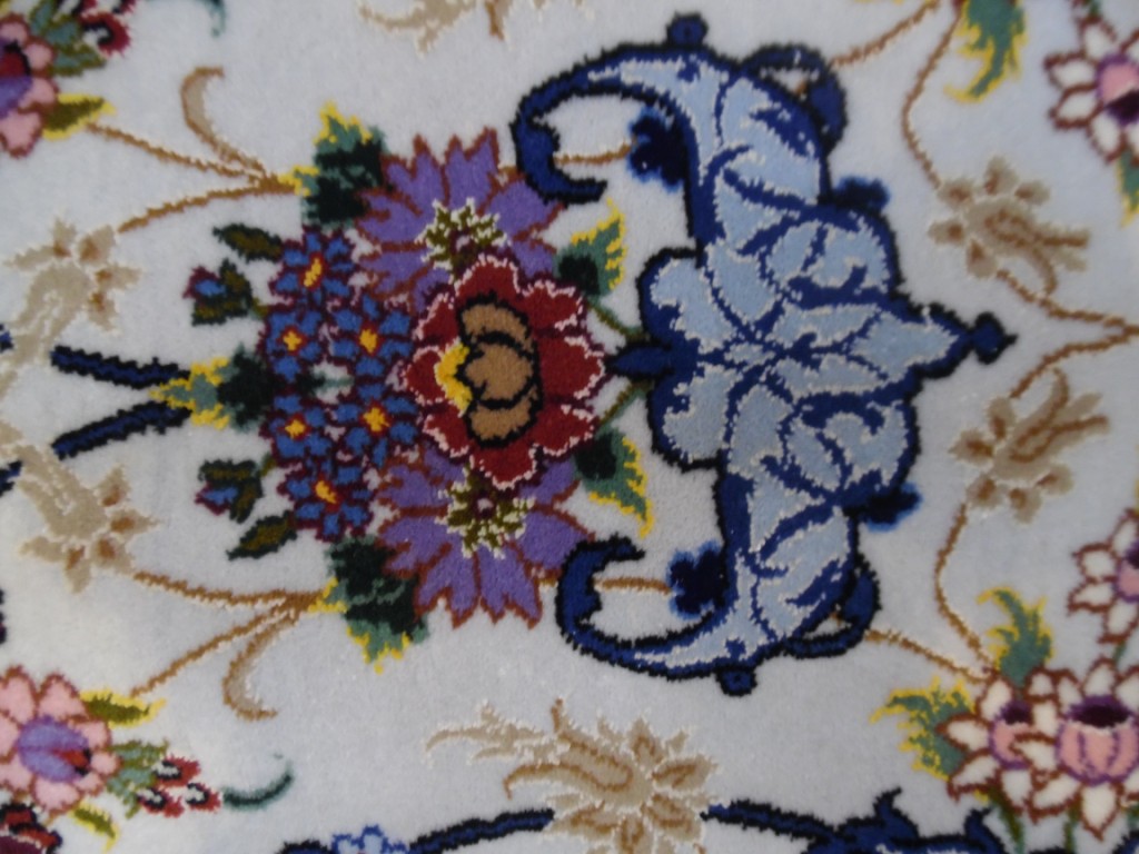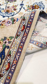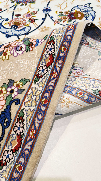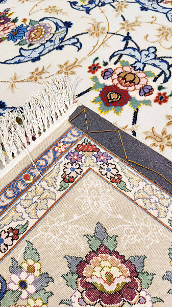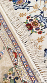 Рисунок состоит из переплетающихся мелких цветочков и веток. Характерное сочетание голубоватых тонов и цвета слоновой кости стало настоящей торговой маркой здешних мастеров. В персидском языке существуют специальные технические наименования -кхахарла, шешла и нохья, -которые обозначают кол-во нитей в пряди (соответственно 4,6 и 9). Между тем Наин, хотя и расположен неподалеку от издавна славившегося своими коврами Исфахана, сам не является древним центром ковроткачества. Многочисленные мануфактуры по производству ковров ручной работы появились здесь лишь в первой половине 20 века. Однако за короткий, по меркам истории ковра, срок город стал одним из самых знаменитых центров коврового производства.