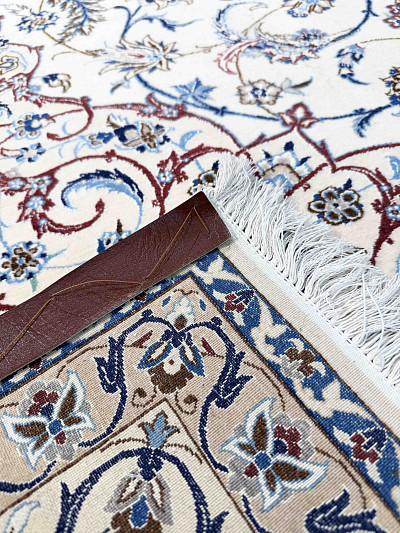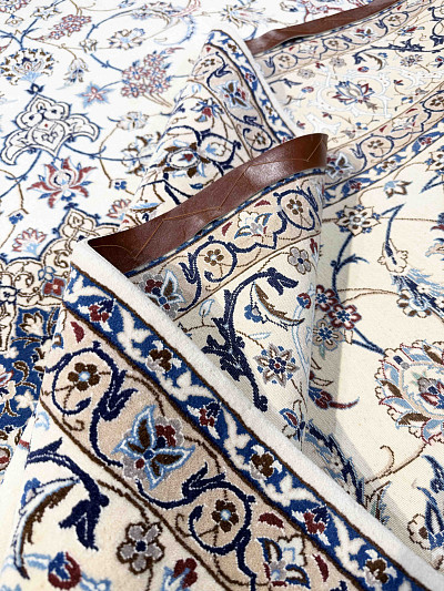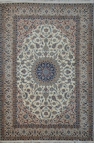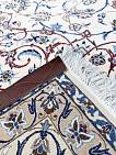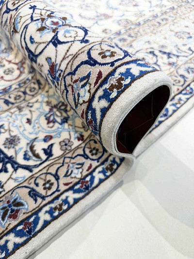 Рисунок состоит из переплетающихся мелких цветочков и веток. Характерное сочетание голубоватых тонов и цвета слоновой кости стало настоящей торговой маркой здешних мастеров. В персидском языке существуют специальные технические наименования -кхахарла, шешла и нохья, -которые обозначают кол-во нитей в пряди (соответственно 4,6 и 9). Между тем Наин, хотя и расположен неподалеку от издавна славившегося своими коврами Исфахана, сам не является древним центром ковроткачества. Многочисленные мануфактуры по производству ковров ручной работы появились здесь лишь в первой половине 20 века. Однако за короткий, по меркам истории ковра, срок город стал одним из самых знаменитых центров коврового производства.