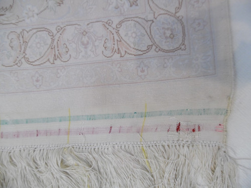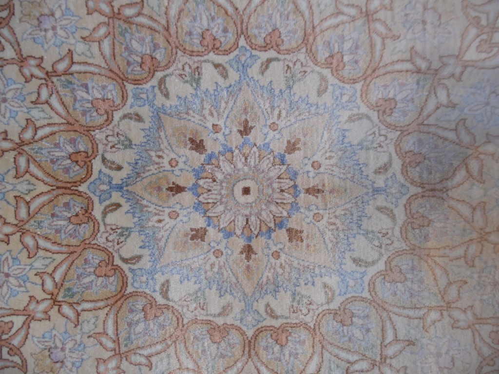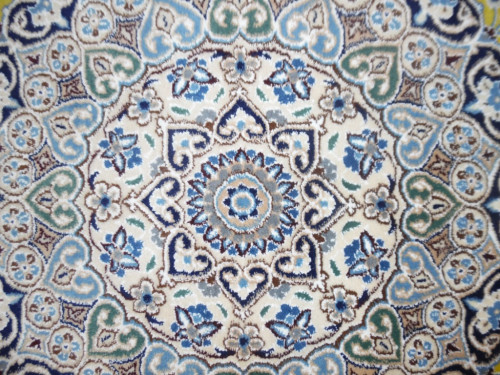 Рисунок состоит из переплетающихся мелких цветочков и веток. Характерное сочетание голубоватых тонов и цвета слоновой кости стало настоящей торговой маркой здешних мастеров. В персидском языке существуют специальные технические наименования -кхахарла, шешла и нохья, -которые обозначают кол-во нитей в пряди (соответственно 4,6 и 9). Между тем Наин, хотя и расположен неподалеку от издавна славившегося своими коврами Исфахана, сам не является древним центром ковроткачества. Многочисленные мануфактуры по производству ковров ручной работы появились здесь лишь в первой половине 20 века. Однако за короткий, по меркам истории ковра, срок город стал одним из самых знаменитых центров коврового производства.