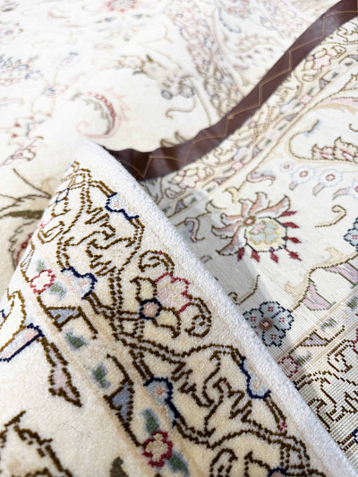 Ковры в сочетании шерсти с шелком из Табриза отличаются аккуратным и кропотливым плетением, вид узла может быть как симметричным, так и асимметричным. Используемые материалы (шерсть, шелк и хлопок) - всегда очень высокого качества. Растительный орнамент, как правило, выполненный на светлой основе, может быть с медальоном в центре или же без него (афшан). Композиции с медальоном, сад, дерево жизни. Кроме того, существует местная композиция, называемая эсуми, предоставляющая собой идущие спирально побеги виноградной лозы, нежные и гибкие, связывающие воедино малые сюжетные мотивы с листьями и цветами.