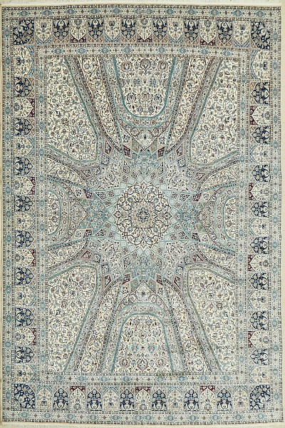 Рисунок состоит из переплетающихся мелких цветочков и веток. Характерное сочетание голубоватых тонов и цвета слоновой кости стало настоящей торговой маркой здешних мастеров. В персидском языке существуют специальные технические наименования -кхахарла, шешла и нохья, -которые обозначают кол-во нитей в пряди (соответственно 4,6 и 9). Между тем Наин, хотя и расположен неподалеку от издавна славившегося своими коврами Исфахана, сам не является древним центром ковроткачества. Многочисленные мануфактуры по производству ковров ручной работы появились здесь лишь в первой половине 20 века. Однако за короткий, по меркам истории ковра, срок город стал одним из самых знаменитых центров коврового производства.
