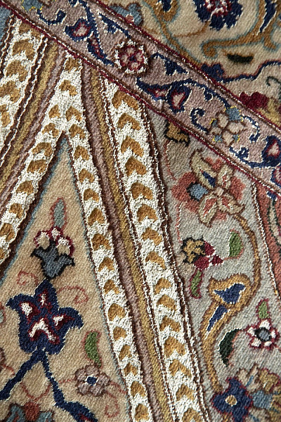 Ковры в сочетании шерсти с шелком из Табриза отличаются аккуратным и кропотливым плетением, вид узла может быть как симметричным, так и асимметричным. Используемые материалы (шерсть, шелк и хлопок) - всегда очень высокого качества. Растительный орнамент, как правило, выполненный на светлой основе, может быть с медальоном в центре или же без него (афшан). Композиции с медальоном, сад, дерево жизни. Кроме того, существует местная композиция, называемая эсуми, предоставляющая собой идущие спирально побеги виноградной лозы, нежные и гибкие, связывающие воедино малые сюжетные мотивы с листьями и цветами.